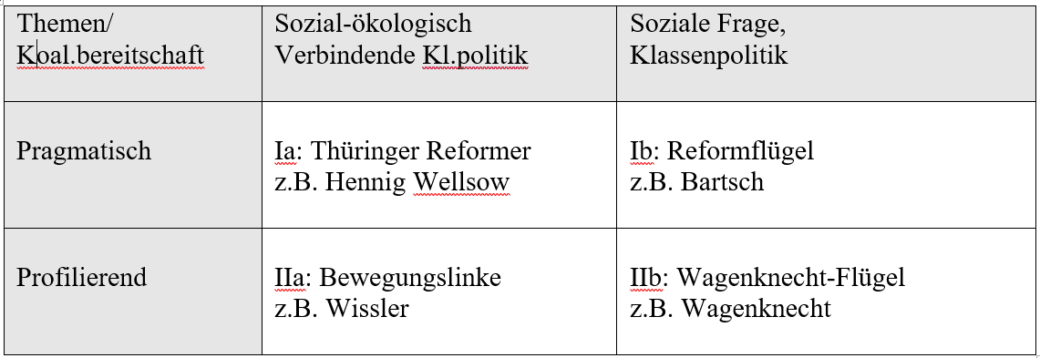 - In der laufenden Strategiedebatte nach der Wahlniederlage und vor dem Parteitag gibt es vier Grundpositionen zur Ausrichtung der praktischen Politik der Partei in den kommenden Jahren. Die erste Säule will ein breites sozial-ökologisches Programm, die zweite einen sozial und klassenpolitischen Fokus. Innerhalb der Säulen gibt es jeweils eine pragmatische auf Regierungsbereitschaft setzende und eine eher profilierende und auf rote Linien setzende Linie.